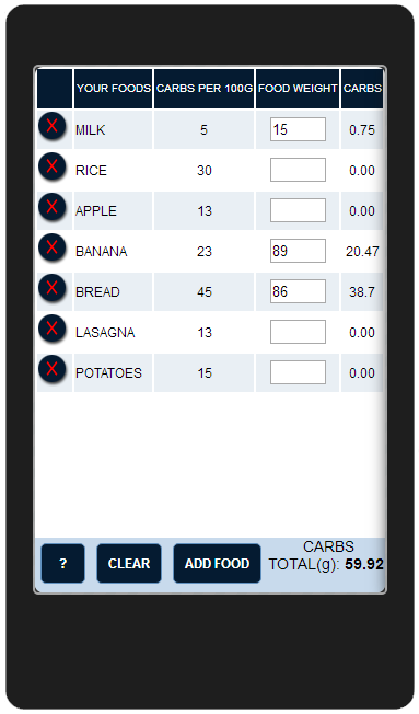 Carb Calc provides you with the ability to create your own small database (or food list) of the foods you eat most, and attach a carb value to those foods.